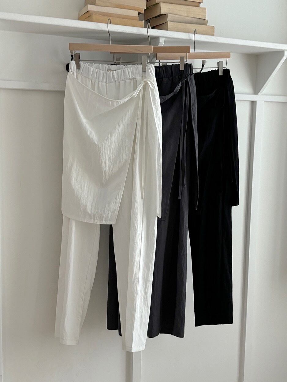 巻きスカートを重ねて着たようなレイヤードデザインパンツです。