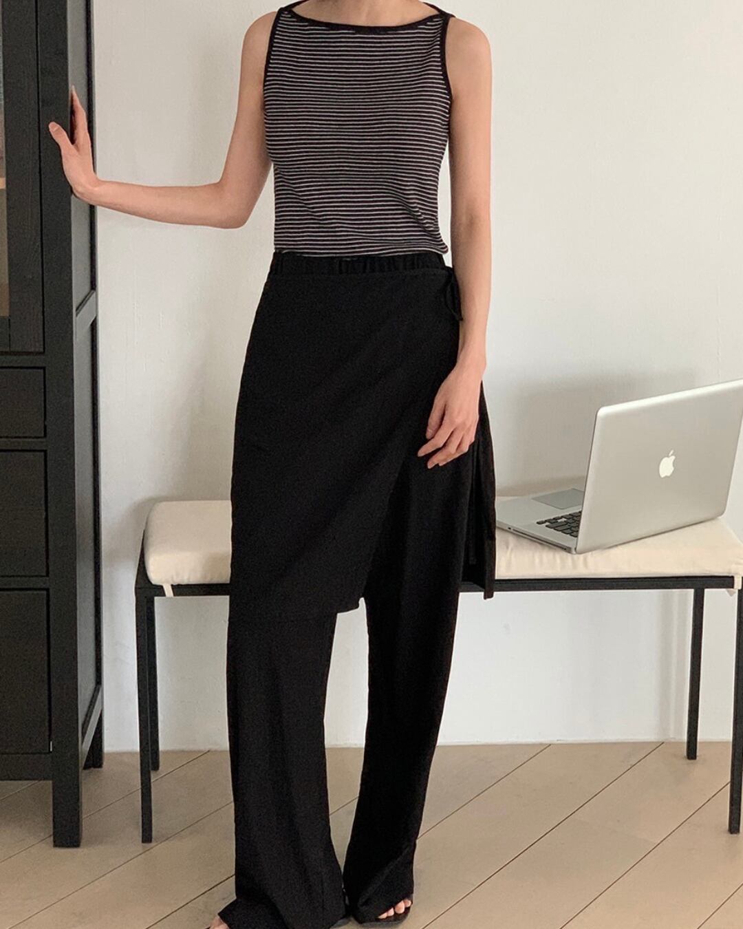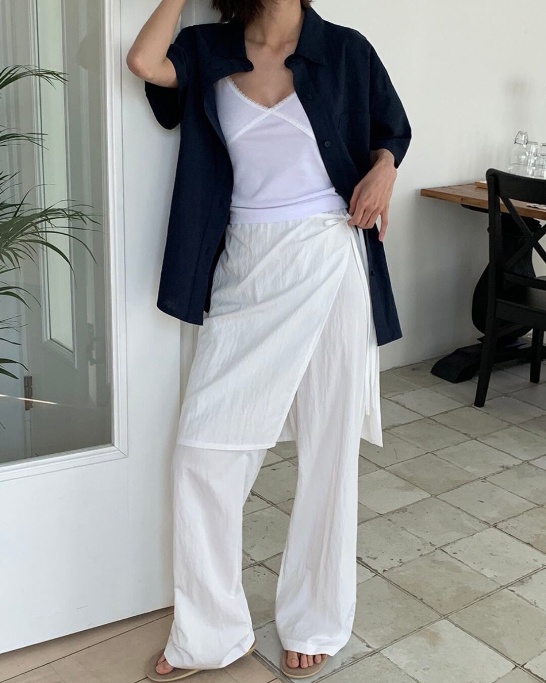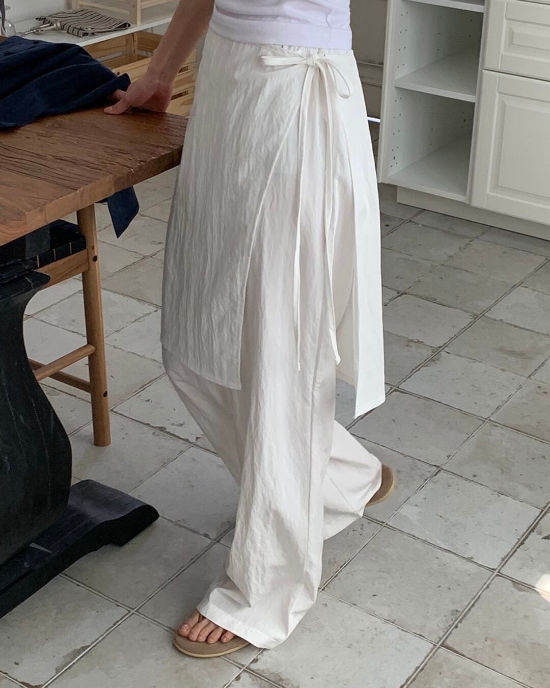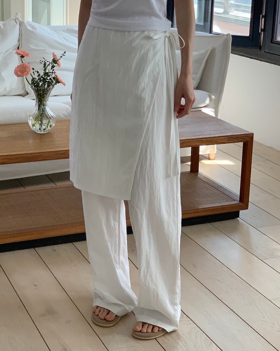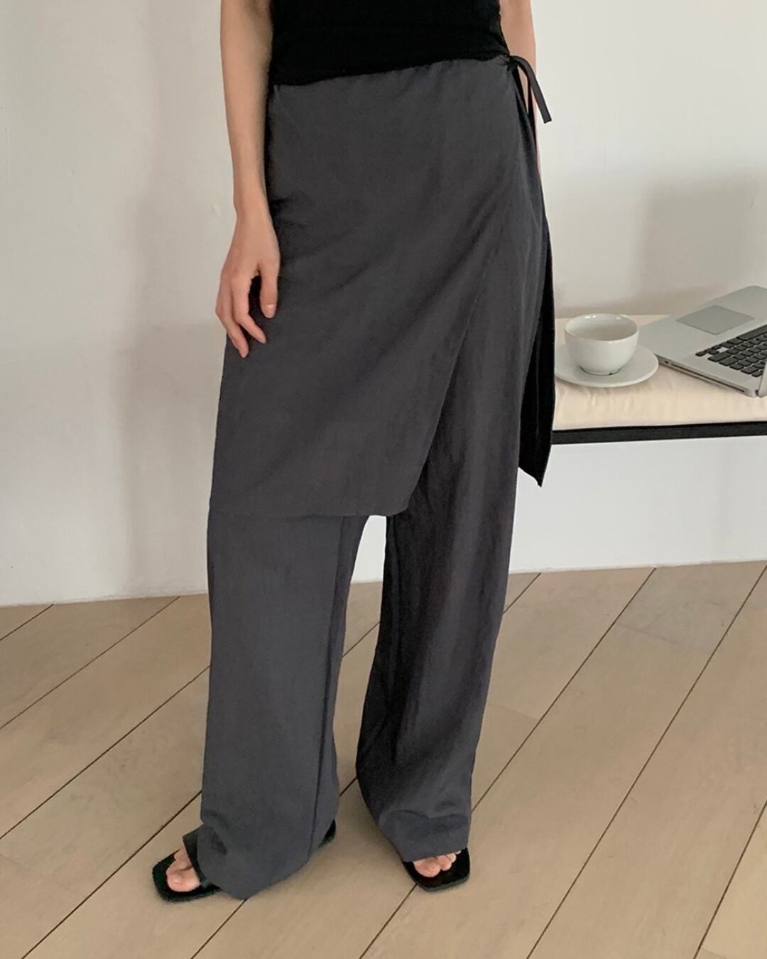 トレンドのラップスカート付きワイドパンツで個性を発揮。