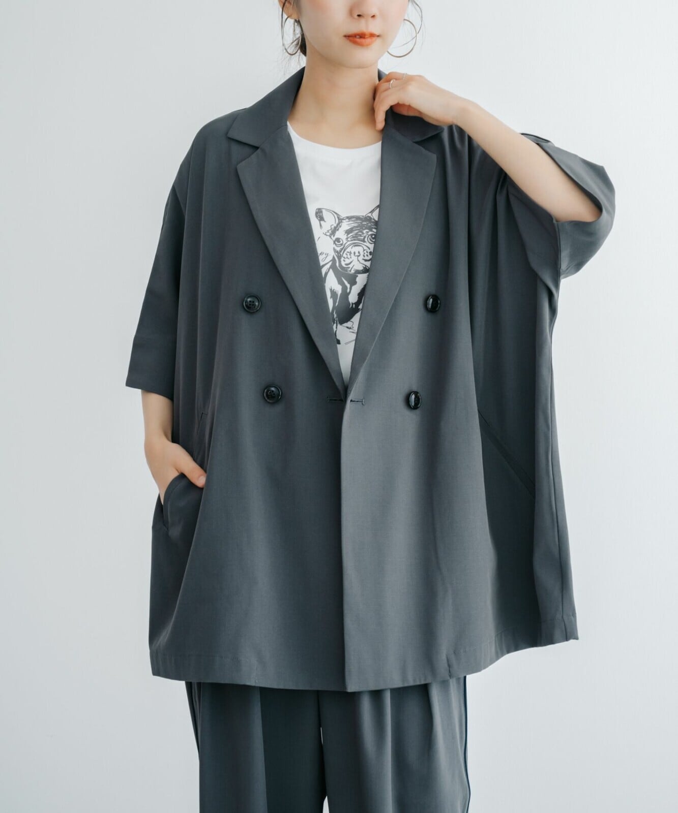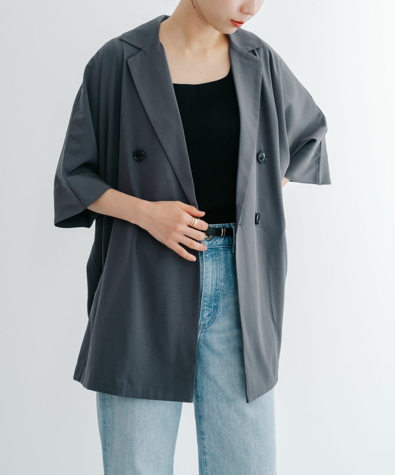 半袖のテーラードジャケットは、ハードルが高そうですが、Tシャツの上にさらりと羽織るだけで一気にきちんと感がでる持っていると便利なアイテムです。