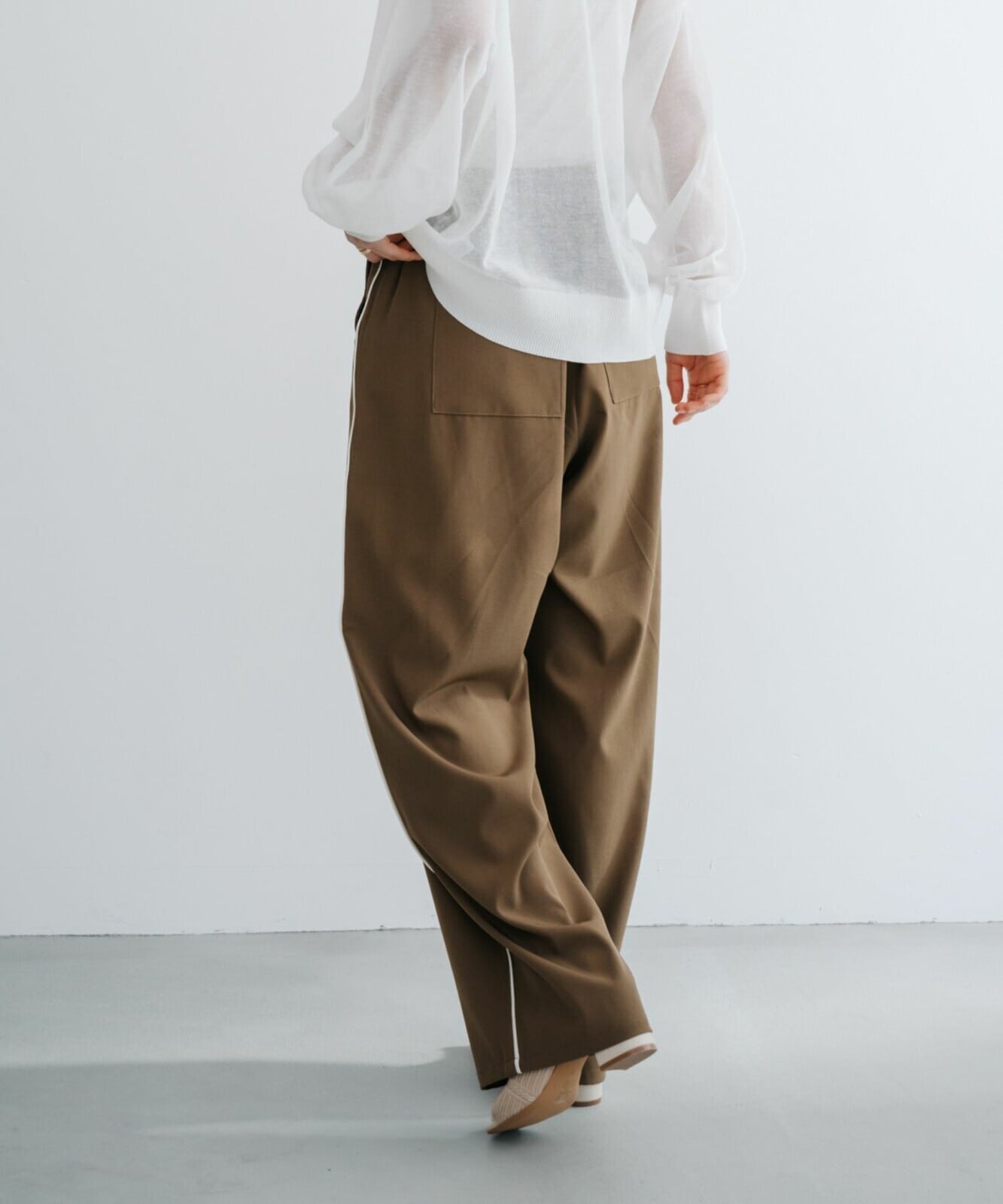 前面に2本のタックを入れているので、ヒップ周りは程よいゆとりのあるストレスフリーで着やすいところもポイントです。